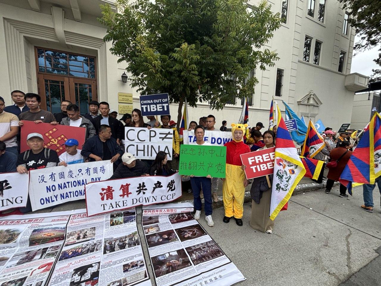 10月1日,中国民主党旧金山党部,中国民主人权联盟,维吾尔人社团,西藏流亡社团,香港人社团齐聚中国驻旧金山领事馆,抗议中共非法政权统治及迫害中国人民76年。