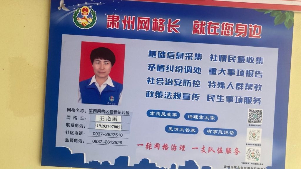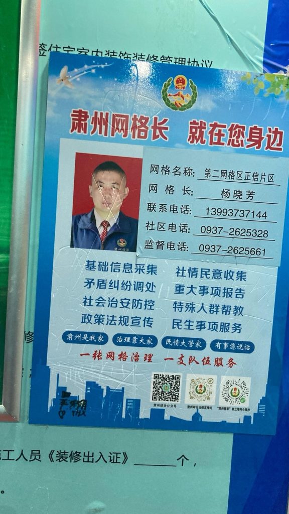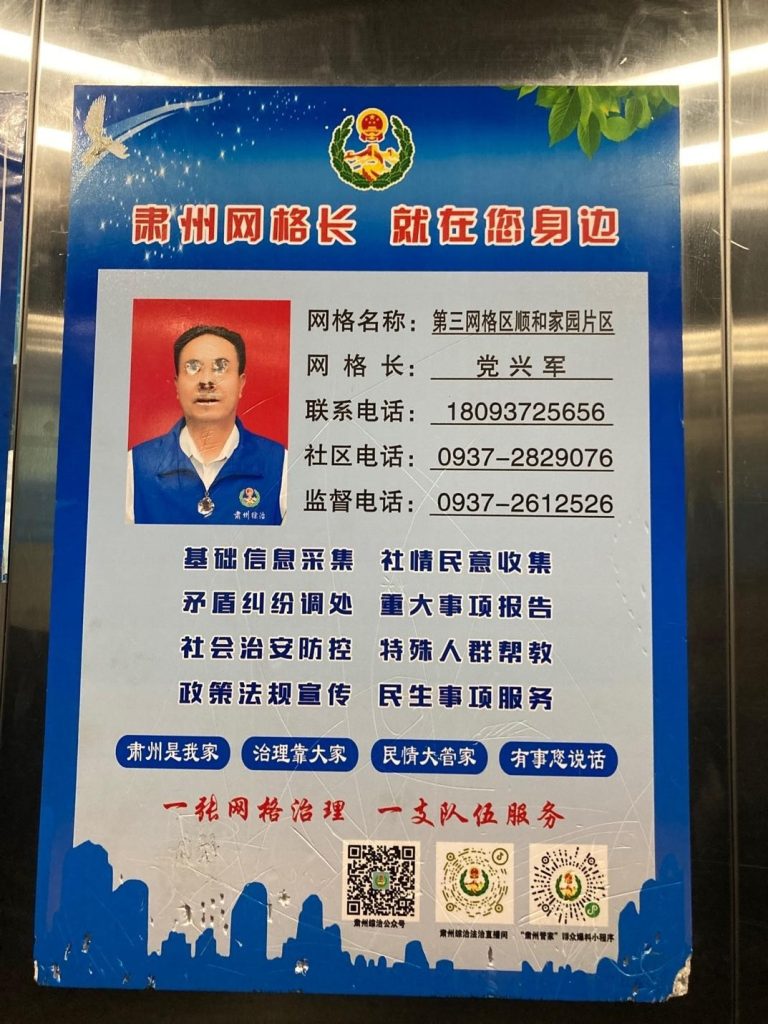 Inside that elevator, I met the same red-background ID photo again and again: a person in a blue vest, their name and phone number printed beneath the title Grid Officer. The poster looked neat, almost bureaucratically kind—“Serving the People,” it claimed.