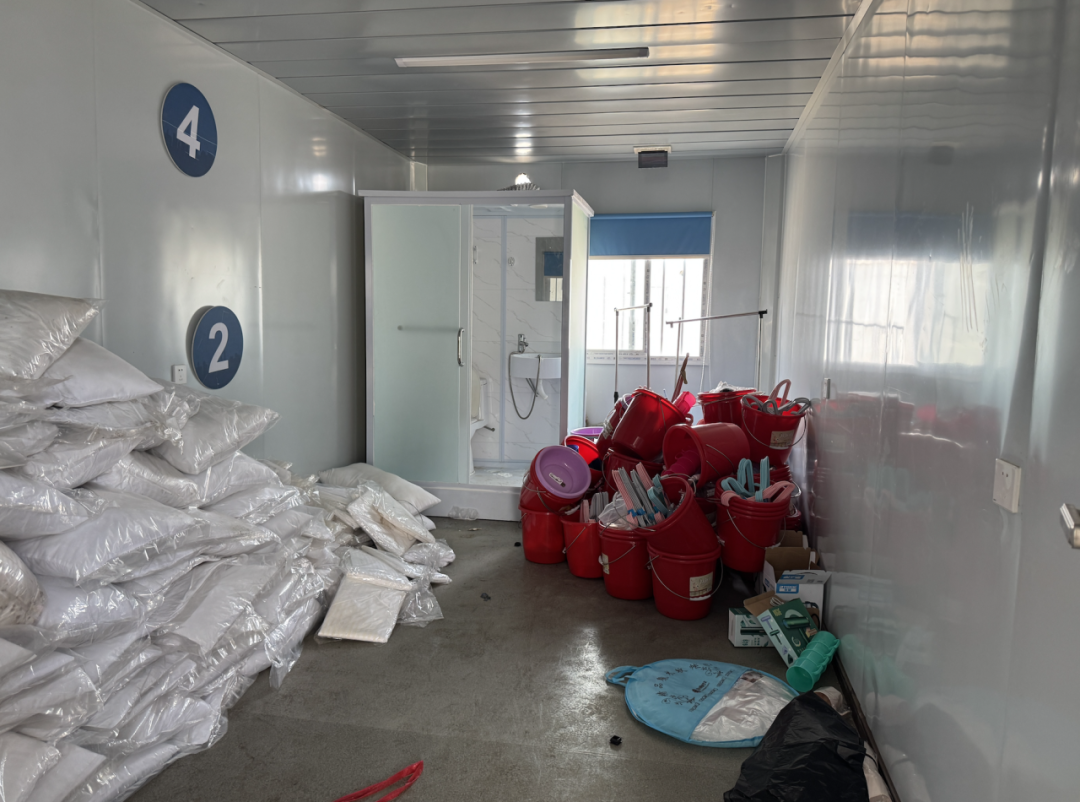 南沙方舱内部,单间隔离房还保留着完整洗漱设施,如今堆放着各类生活用品