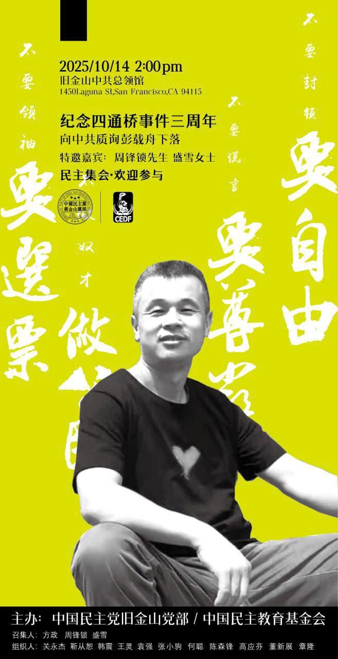 活动通知 旧金山 10月14日 纪念四通桥事件三周年 由 Zhijun Zhang - 2025年10月13日 0 235 FacebookTwitter 旧金山活动信息: 10月14日(周二)下午,将举办纪念四通桥事件三周年集会,方政、周锋锁、盛雪等民运前辈,将带领大家向中共质询彭载舟下落,声讨暴政恶行。 地点:旧金山中共总领馆 主办:中国民主党旧金山党部/中国民主教育基金会 活动收集:胡丽莉