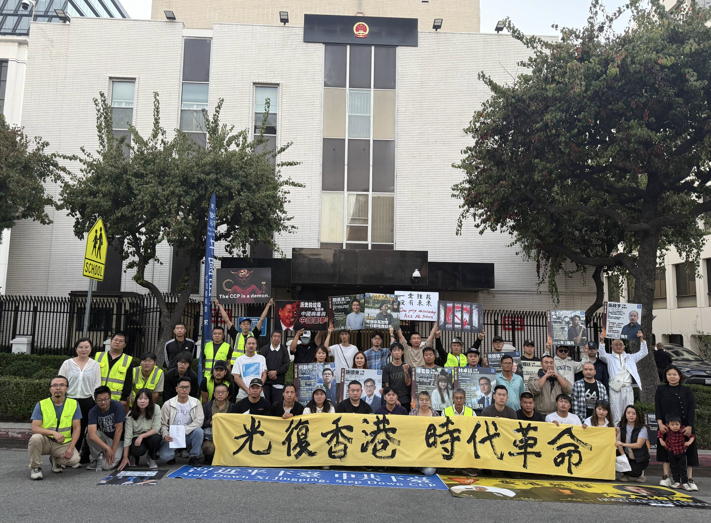 (图片提供:张宇;图为张宇参加洛杉矶领事馆门口举行的集会活动)