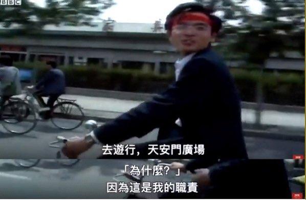 看到这段视频,我的思绪回到了初三那年。那一年,我第一次学会“翻墙”,第一次看到了关于六四事件的影像。屏幕上,一个大学生映入眼帘,戴着眼镜,头上绑着红色头带。他的眼神坚定,骑着自行车奔向天安门广场。他说:“去游行,去天安门广场“。记者问他为什么 他回答“I think It’s my duty”。”短短一句话,却让我第一次理解责任感和勇气。画面中的他,不只是一个学生,更像是历史的一部分——一个时代里敢于站出来的人。