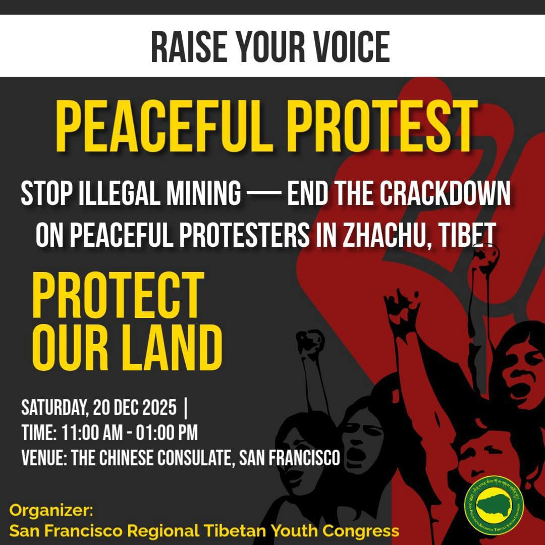活动通知 旧金山 12月20日 藏人和平抗议 停止镇压 守护扎曲 由 Lili Hu - 2025年12月19日 0 102 和平抗议 停止非法采矿——结束对西藏扎曲和平抗议者的镇压 保护我们的土地! 时间:2025年12月20日 星期六 上午11:00-下午1:00 地点:旧金山中国领事馆 组织者:旧金山地区西藏青年会