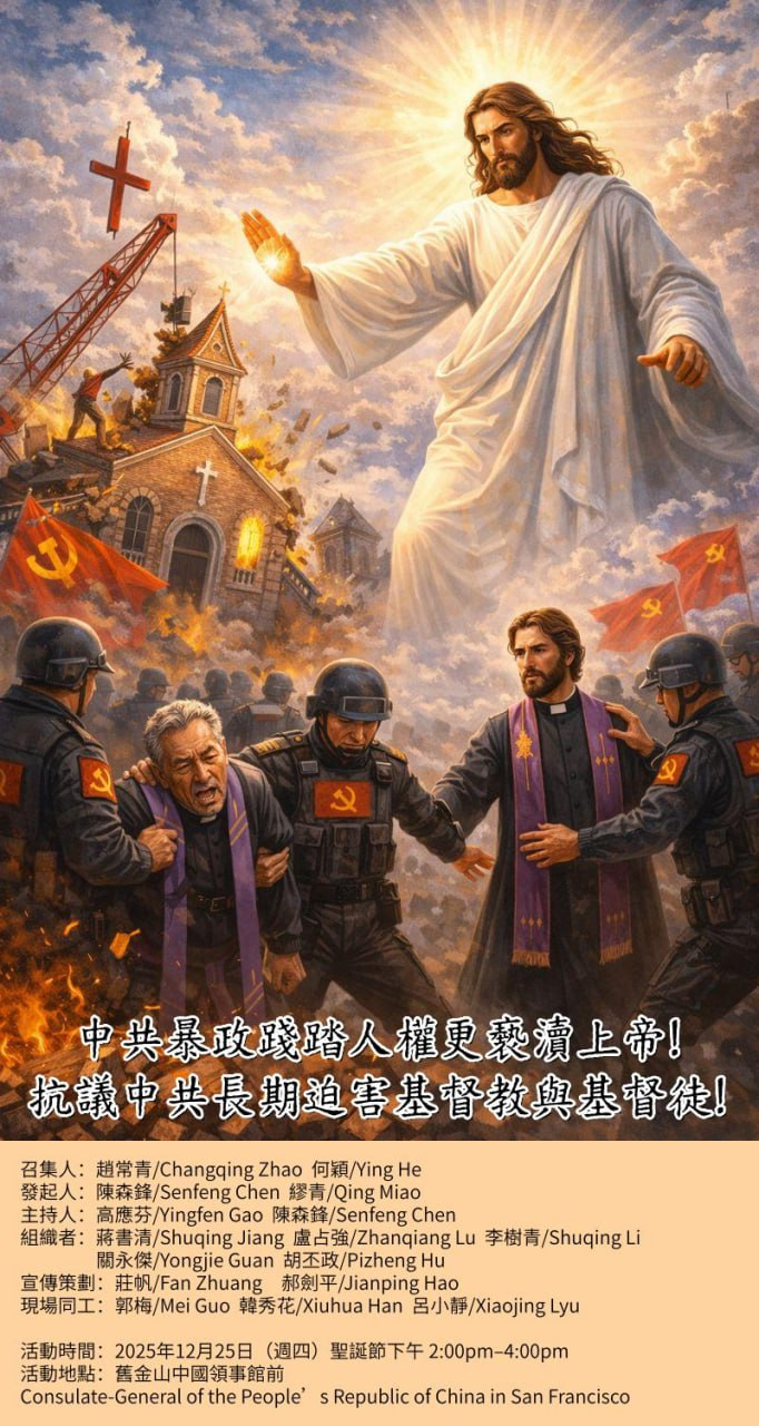 (2025年12月25日(週四)聖誕節下午 2:00pm–4:00pm,舊金山中共領事館前,邀請弟兄姊妹、牧者、基督徒踴躍參加活動)