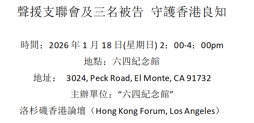 爲了聲援支聯會及三位被告,一群流散在美國的香港及中國大陸人士,選擇在案件開審前夕,於洛杉磯“六四紀唸館”舉行集會。這不僅是一場聲援行動,更是一場見証。多位六四事件的親曆者、幸存者與長期研究中國政治與法律的學者,將以各自的經曆與專業判斷,回應對支聯會的指控。