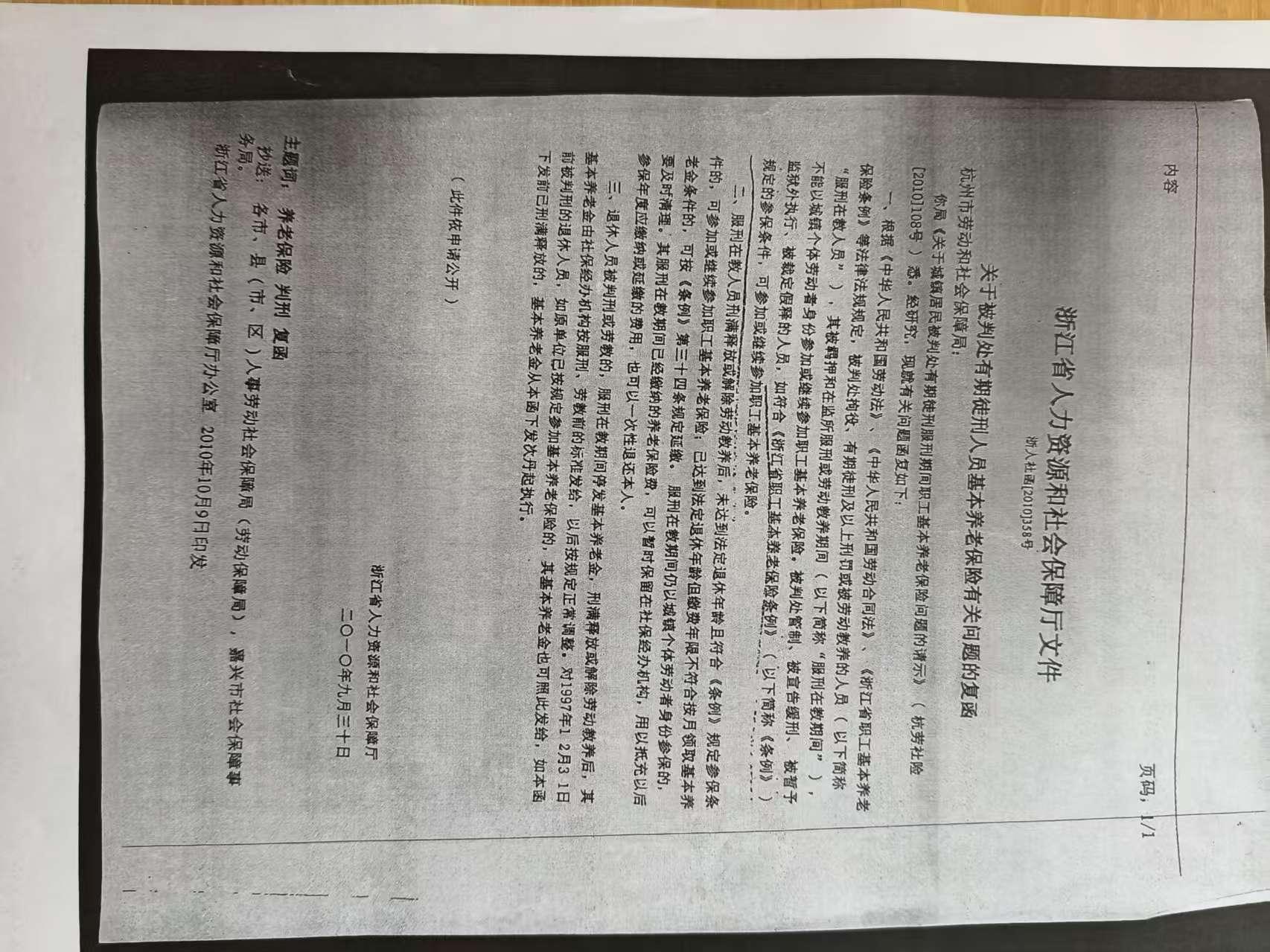 From the “Notice” provided by the Hangzhou Gongshu District Social Insurance Management Service Center, it can be seen that its reason for repudiating the agreement and refusing to perform its social insurance obligations to me is based on Article 2, Paragraph 1, and Article 72 of the Labor Law of the People’s Republic of China; Article 10, Paragraphs 1 and 2, of the Social Insurance Law of the People’s Republic of China; and the “Reply on Issues Concerning Basic Pension Insurance for Persons Sentenced to Fixed-Term Imprisonment” (Zhejiang Human Resources and Social Security Letter [2010] No. 358). These provisions assert that incarcerated persons do not fall within the scope of insured participants in employee basic pension insurance, that participation during imprisonment constitutes irregular enrollment, and that contributions paid during such periods should be refunded.