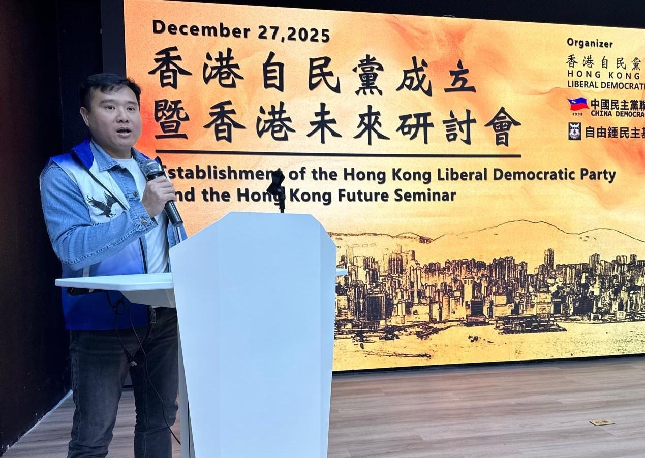 12月27日下午,City of Industry 的会场里坐着两排人。前排多是流亡港人,约二十位;后排与两侧则是声援团体成员,约三十位。舞台背景板上用中英双语写着:“香港自民党成立暨香港未来研讨会”。灯光打在那行字上,像把一个曾经被迫沉默的议题,硬生生重新照亮。