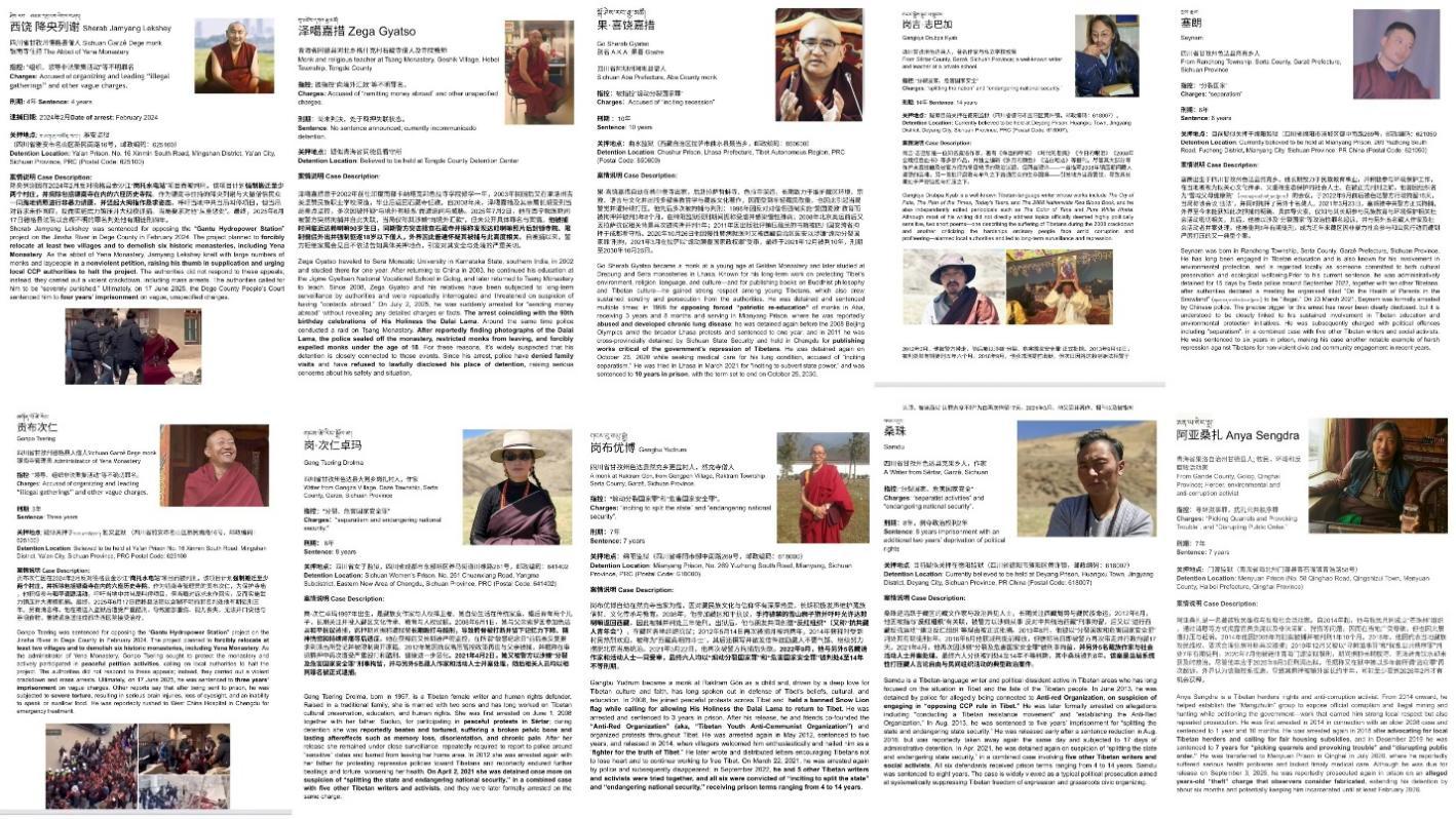 These ten Tibetans were sentenced or detained on vague charges such as “splitting the nation,” “endangering national security,” and “illegal assembly” for nonviolent expression, religious activities, cultural preservation, or social advocacy. Their detention centers are primarily concentrated within the prison systems of Sichuan, Qinghai, and the Tibet Autonomous Region. Multiple detainees have been reported to have suffered torture, deteriorating health, or isolation from the outside world during their incarceration.
