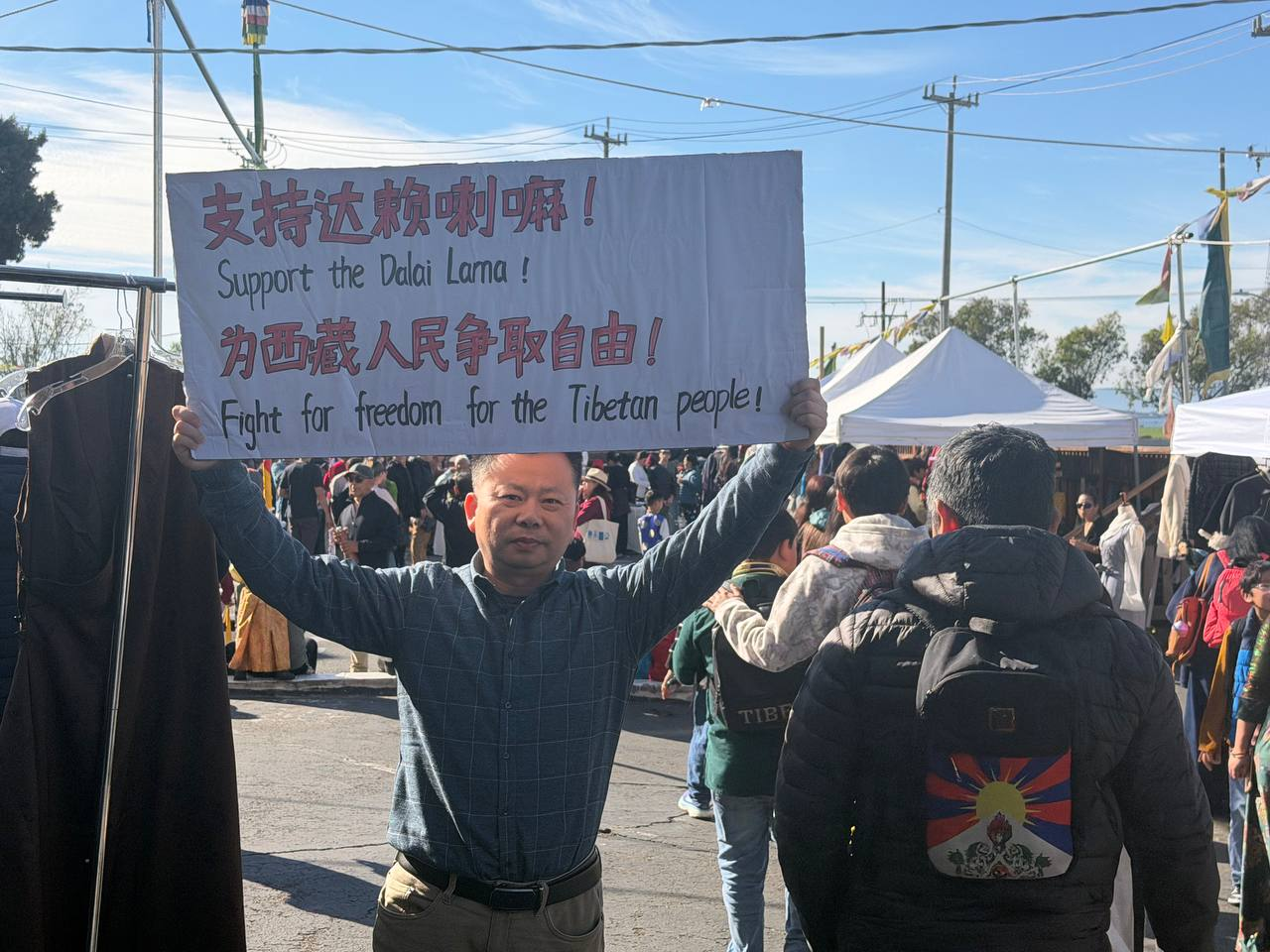 李栩则携带自制标语,在市集现场高举展示,表达对西藏人民争取自由与人权的支持。