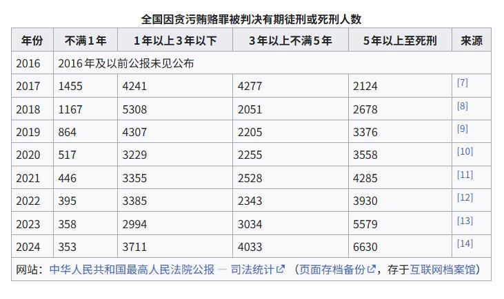 根据最高人民法院公布的司法统计,近几年全国因贪污贿赂罪被判刑的人数,发生了显著变化,其中最引人注目的是重刑比例的持续攀升。2017 年,被判处五年以上有期徒刑直至死刑的人数为 2124 人,到 2024 年,这一数字已上升至 6630 人,短短数年间增长超过三倍。重刑比例持续上升,那么问题显然不在个别官员贪腐,而在于一个能够长期容纳大规模权钱交易的制度环境。