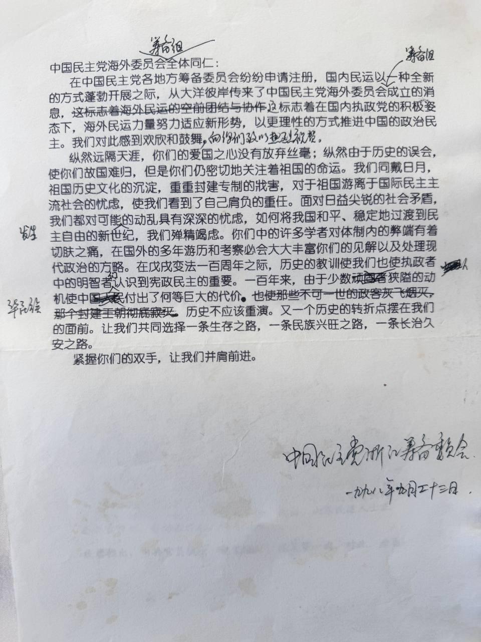 纵然远隔天涯,你们的爱国之心没有放弃丝毫;纵然由于历史的误会,使你们故国难归,但是你们仍密切地关注着祖国的命运。我们同戴日月,祖国历史文化的沉淀,重重封建专制的戕害,对于祖国游离于国际民主主流社会的忧虑,使我们看到了自己肩负的重任。面对日益尖锐的社会矛盾,我们都对可能发生的动乱具有深深的忧虑,如何将我国和平、稳定地过渡到民主自由的新世纪,我们殚精竭虑。你们中的许多学者对体制内的弊端有着切肤之痛,在国外的多年游历和考察必会大大丰富你们的见解以及处理现代政治的方略。在戊戌变法一百周年之际,历史的教训使我们也使执政者中的明智者们认识到宪政民主的重要。一百年来,由于少数人狭隘的动机使中华民族付出了何等巨大的代价。历史不应该重演。又一个历史的转折点摆在我们的面前。让我们共同选择一条生存之路,一条民族兴旺之路,一条长治久安之路。