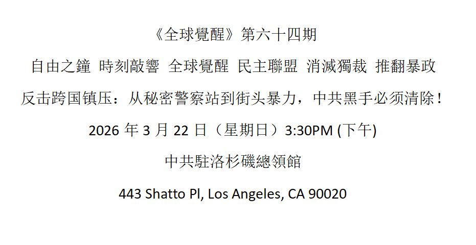 我们坚决支持国际社会深入彻查中共的渗透势力。从秘密警察站的跨国管辖到洛杉矶街头的肉体伤害,中共的暴力黑手必须被彻底斩断!我们呼吁所有追求自由的同胞,不要被这种流氓行径所吓倒。我们不仅要揭露中共这个“政治假货”,更要让世界看清它是一个跨国犯罪集团。我们将持续站在中领馆前,直到正义得到伸张,直到暴力威胁被根除,直到自由的光芒照亮整个中国!