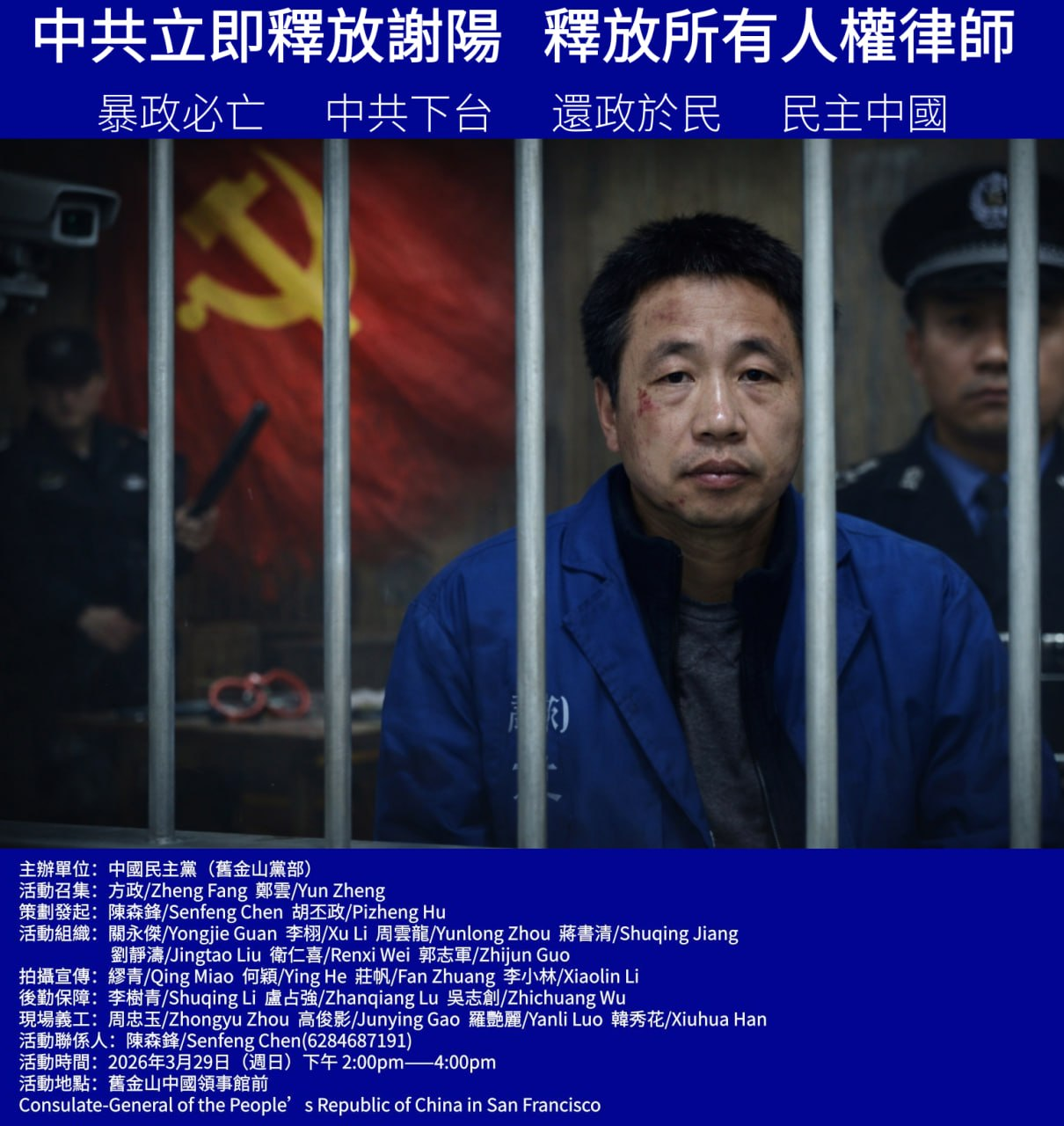 活動公告:中共立即釋放謝陽!釋放所有人權律師!