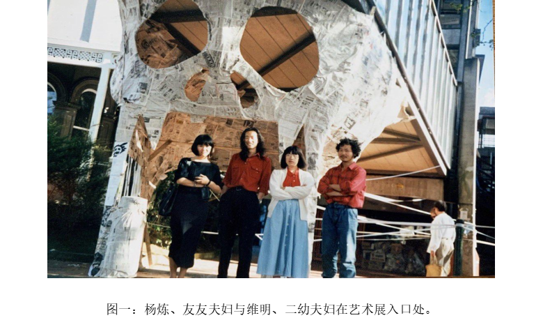 想当年,顾城一家、杨炼一家与我们一家,都定居在新西兰而成为好友。不想今天由超华转来杨炼夫妇在37年前和我们一起在新西兰的合影!这是我们共同举办“面对死亡坚持生命”的行为艺术展上,在奥克兰大学入口处,我用报纸糊了一个大骷髅作为艺术展的入口,合影留念就在此入口处。