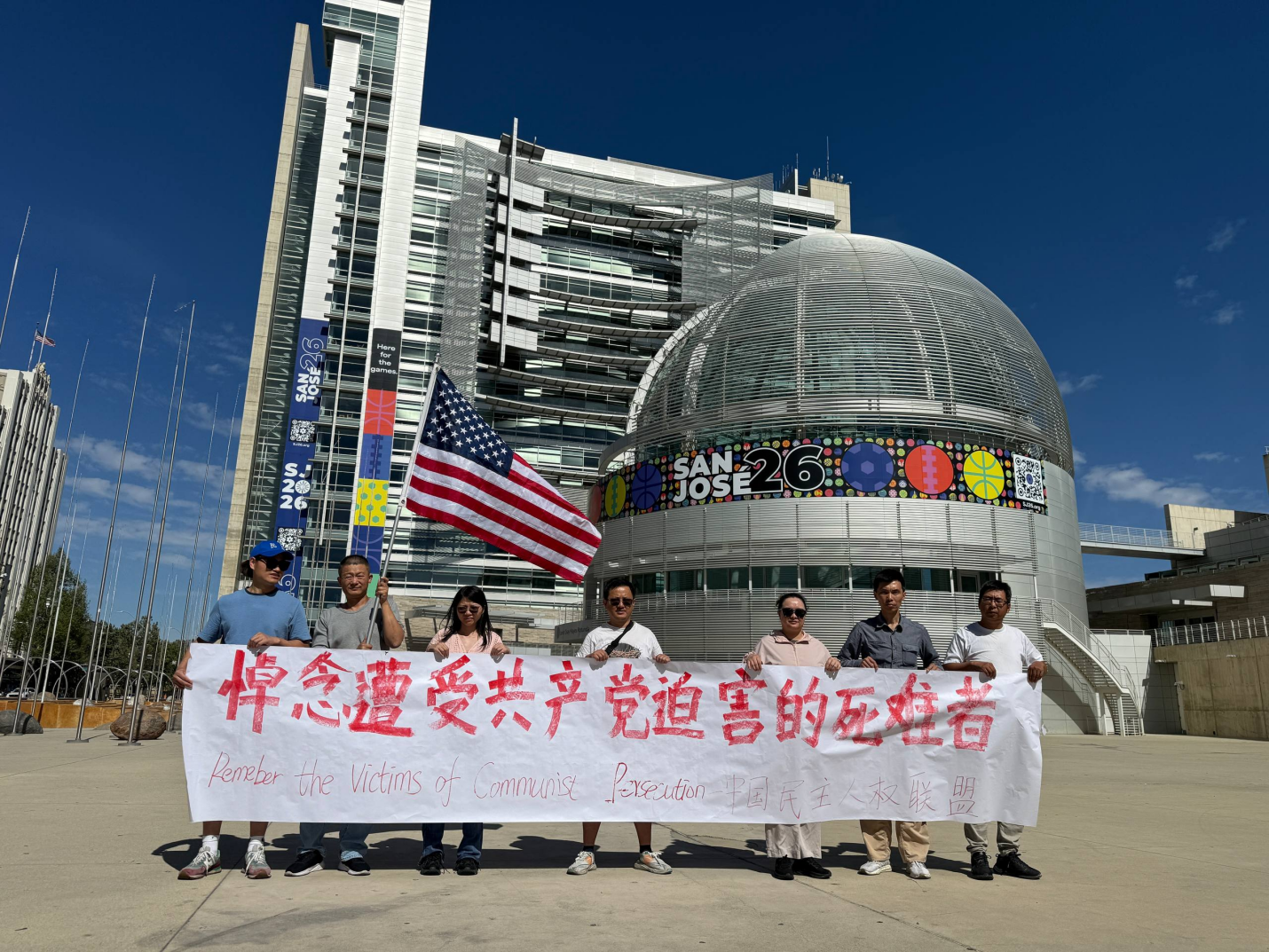 2026年4月5日清明节之际,中国民主人权联盟在圣荷西市政广场举行悼念活动,悼念在中国历次政治运动与社会政策中逝去的生命,呼吁铭记历史、反思悲剧。