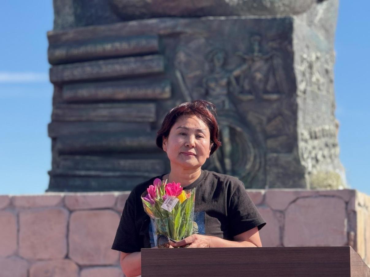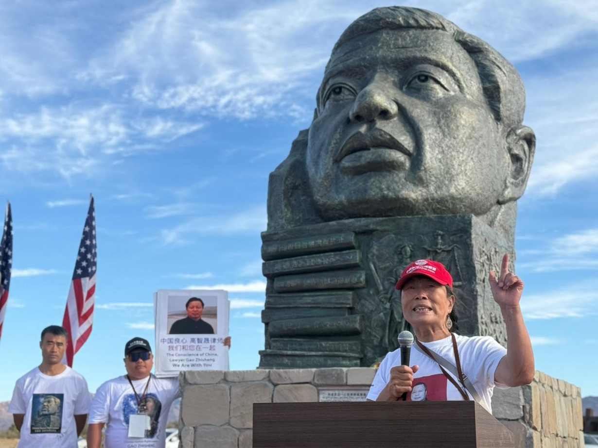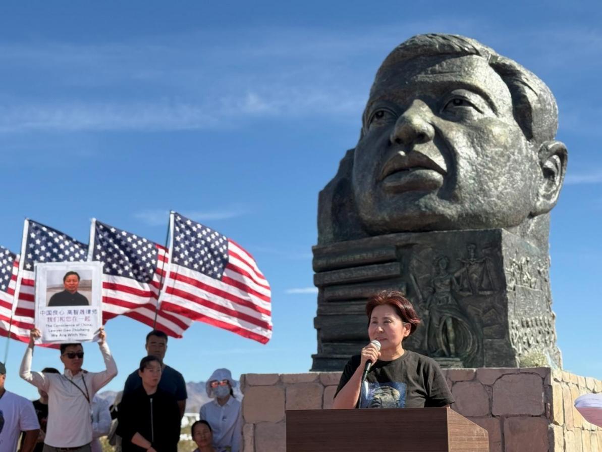 Geng He delivers a speech, sharing memories of her life with Gao Zhisheng and laying flowers at the statue