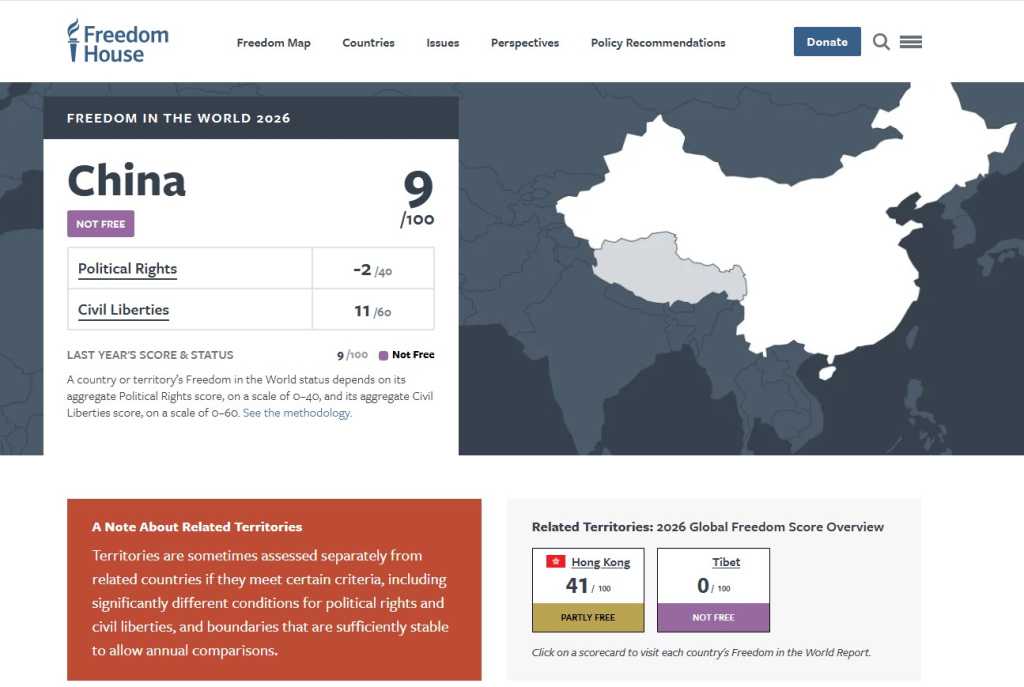 In its 2026 Freedom in the World Report, Freedom House continues to classify China as “Not Free,” with a total score of just 9 out of 100.